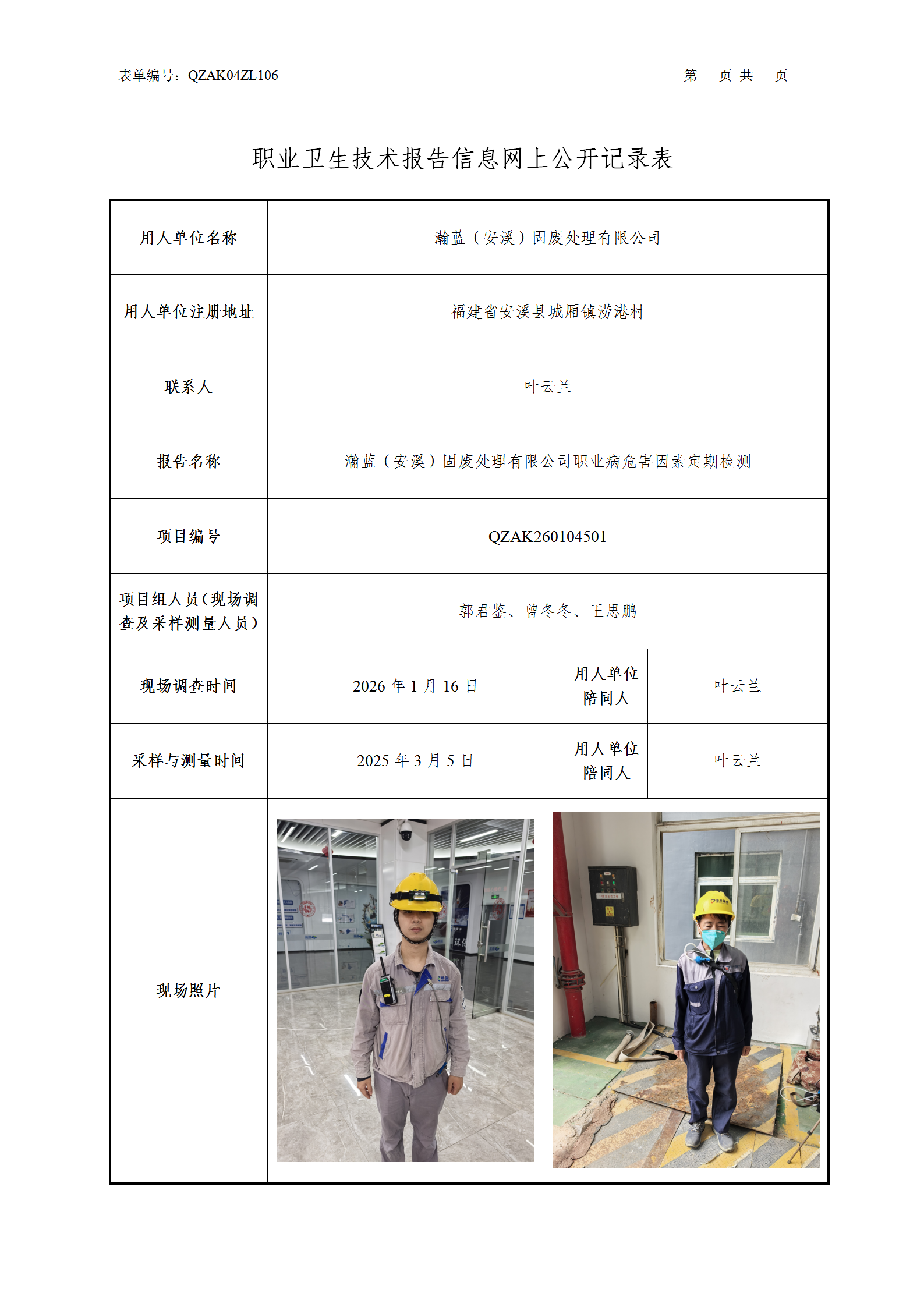瀚蓝(安溪)固废处理有限公司职业卫生评价项目公开信息表